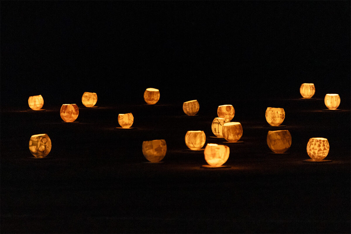 亀岡の伝説にちなんだ桑のほか、桜やマリーゴールドなど地域で見つけたり育てたりした色々な植物で染めた紙を使って、市民のみなさんとともに、たくさんのランタンを作ってきました。秋に点灯した様子とともに、プロジェクトを紹介します。